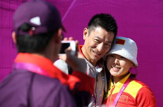 Hong Kong singer and actor Andy Lau, second right, poses for a photo with Chinese Paralympic archer Gao Fangxia during his visit to the London 2012 Paralympics athletes as the Love Ambassador to the Chinese delegation at the Royal Artillery Barracks in London, Sept 5, 2012. [Photo/Xinhua]