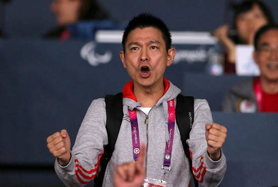 Hong Kong singer and actor Andy Lau cheers for Hong Kong Paralympic wheelchair fencer Tam Chik-sum during his visit to the London 2012 Paralympics athletes as the Love Ambassador to the Chinese delegation in London, Sept 5, 2012. [Photo/Xinhua]