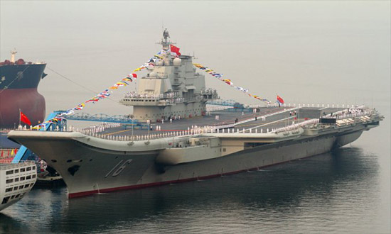 A photo provided by an unnamed source shows a ceremony being held on the newly finished aircraft carrier in Dalian, Liaoning Province on Sunday. Military enthusiasts have been speculating that China's first aircraft carrier has been deployed by the navy. Experts have disagreed, however. The Ministry of National Defense declined to comment Sunday.