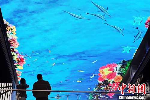 Photo taken on January 28 shows visitors look at a 168-meter-long LED screen in Xi'an of Northwest China's Shaanxi Province. [Photo / Zhang Yuan]