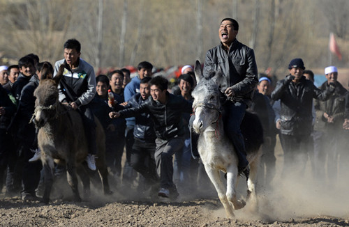 Villagers compete in a donkey race in Haiyuan, Northwest China's Ningxia Hui autonomous region, on Feb 6, 2013. [Photo/Xinhua]
