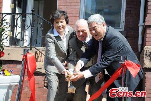 Director-general at the Office of Chinese Language Council International Xu Lin (L), George Washington University President Steven Knapp (C) and Nanjing University Chancellor Hong Yinxing (R) cut the ribbon for the GW Confucius Institute building in the District, April 10, 2013. Opening the first Confucius Institute inside the nation's capital represented a milestone for promoting the study of Chinese language and culture. [CNS Photo/Wu Qingcai]