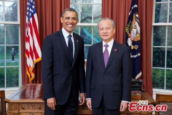 U.S. President Barack Obama meetw with new Chiense Ambassador to the US Cui Tiankai and receives his credentials at the White House, April 15, 2013. [Image provided by The White House]