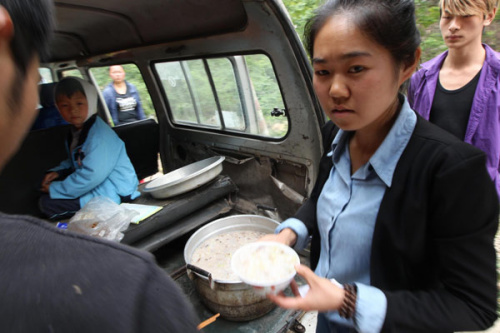 Yue Yan serves porridge to rescue workers, April 22, 2013. [Photo/Xinhua]