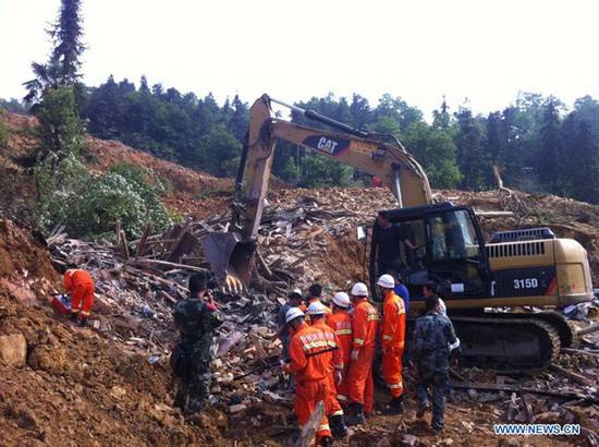 Photo taken by mobile phone shows rescuers work at the scene of a landslide in Mawo Village in Bijie City, southwest China's Guizhou Province, April 27, 2013. The landslide hit Mawo Village at 12:50 p.m. (0450 GMT) on Saturday, leaving 3 villagers dead and another 5 buried. All-out rescue work is under way. (Xinhua)