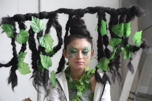 A Shandong University of Art and Design senior dresses up with headwear at a design art show in Jinan on Tuesday. The art show was held by senior students of the university who will graduate this summer. [Photo by Zheng Tao/ For China Daily]