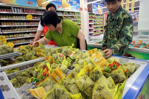 Customers snap up zongzi at a supermarket in Zhoukou, Henan province, on June 6, 2013. Zongzi is a hot seller before Dragon Boat Festival. [Photo by Jin Yuequan/Asianewsphoto]