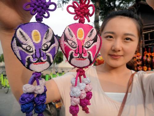 A woman shows two scented sachets, or xiangnang, she just bought at the folk art exhibition in Suzhou, Jiangsu province. Wearing xiangnang, often stuffed with scented herbs, is one of the traditional customs for Dragon Boat Festival. It is believed that the scented bags can ward off odor-bred bugs and diseases. [Photo by Wang Jiankang/Asianewsphoto]