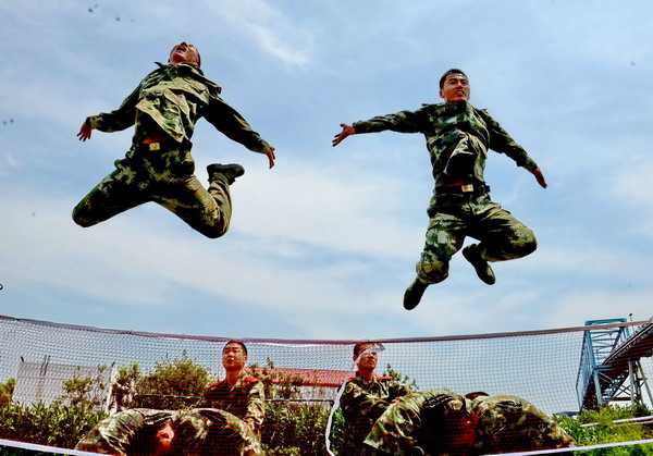 Two soldiers jump over a barrier during a military drill in Qinghuangdao city, North China's Hebei province, July 29. [Photo/Xinhua]