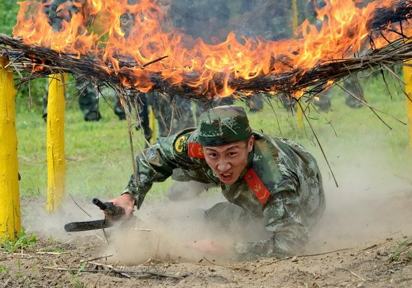 A soldier crawls as fast as he can under flaming wires, testing himself in extreme conditions during a military drill in Qinghuangdao city, North China's Hebei province, July 29. [Photo/Xinhua]