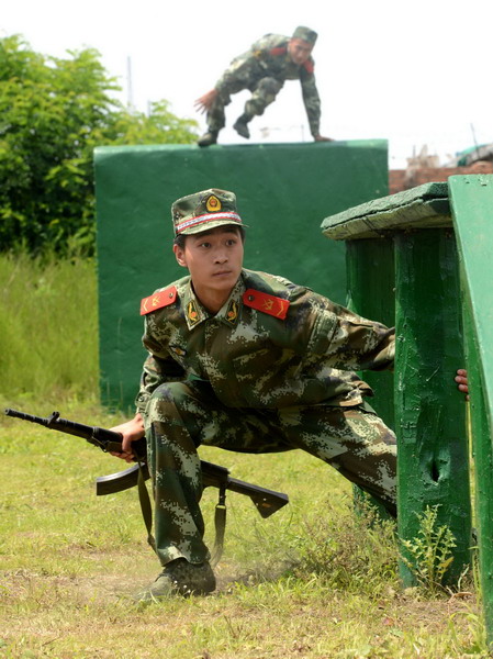 A soldier tests his speed and agility as his squad races along an obstacle course. [Photo/Xinhua]