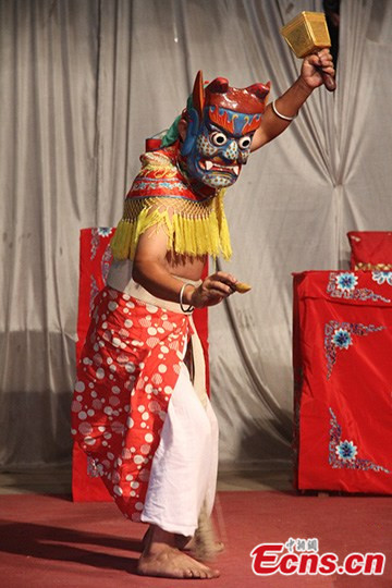 An actor performs Guangchang Meng Opera at Ganzhu Town of Guangchang County in east China's Jiangxi province on August 1, 2013. The Guangchang Meng Opera, dating back to the early Ming Dynasty (1368-1644), features the legend of Mengjiang Crying at the Great Wall. It was popular in Guangchang county and is over 500 years old. Its aria is in high pitched music, a singing style characterized by the very high, forceful falsetto in which it is sung. [Photo/Wang Jian]