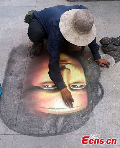 A senior artist paints a portrait of Mona Lisa on the road surface in Shenyang, capital city of northeast China's Liaoning province, on August 12, 2013. [Photo: CNS / Yu Haiyang]