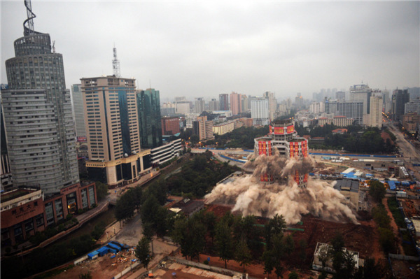 The Workers' Cultural Palace collapses after being demolished by explosives in Kunming, Yunnan province Sept 7, 2013. The 70-metre-high building has been a recreational centre for residents since being completed in 1982. [Photo/Agencies]