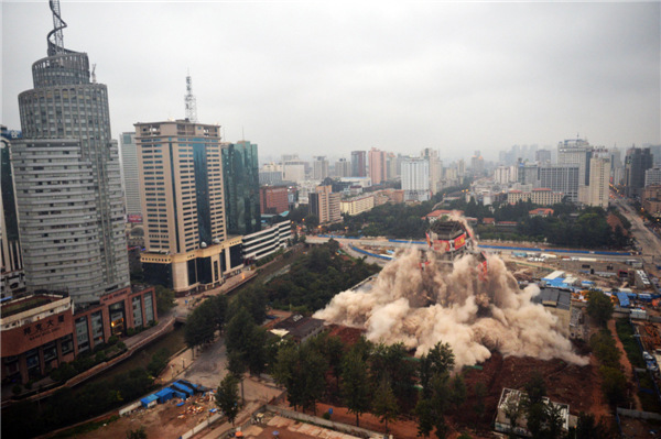 The Workers' Cultural Palace collapses after being demolished by explosives in Kunming, Yunnan province Sept 7, 2013. The 70-metre-high building has been a recreational centre for residents since being completed in 1982. [Photo/Agencies]