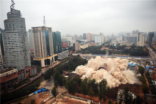 The Workers' Cultural Palace collapses after being demolished by explosives in Kunming, Yunnan province Sept 7, 2013. The 70-metre-high building has been a recreational centre for residents since being completed in 1982. [Photo/Agencies]
