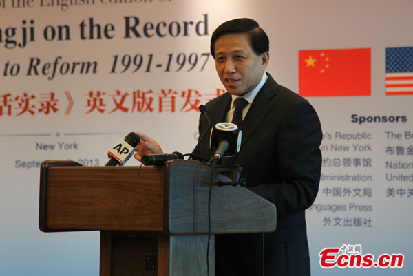 Chinese Vice Foreign Minister Zhang Yesui delivers a speech at the launch ceremony for Zhu Rongji on the Record (English Edition) in New York on September 9, 2013. The English edition of the book is published by the Foreign Languages Press of the China International Publishing Group and the Brookings Institution Press in the United States. It includes 112 speeches, articles, letters and directives selected by Zhu himself from the 348 articles in the Chinese edition. Both Henry A. Kissinger, former U.S. secretary of state, and Helmut Schmidt, former chancellor of West Germany, wrote forewords. [Photo: CNS / Ruan Yulin]