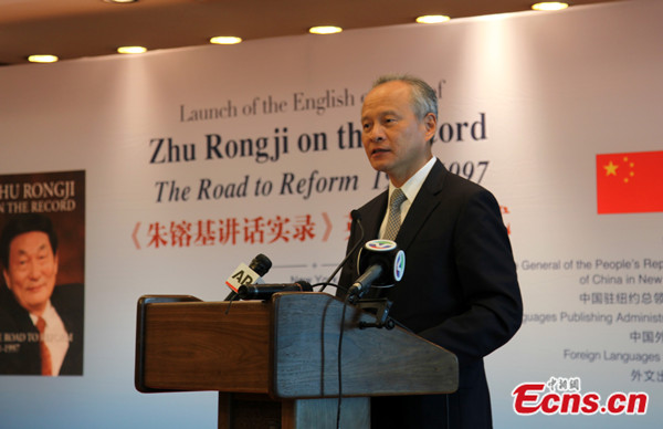 Chinese Ambassador to the U.S. Cui Tiankai delivers a speech at the launch ceremony for Zhu Rongji on the Record (English Edition) in New York on September 9, 2013. [Photo: CNS / Ruan Yulin]