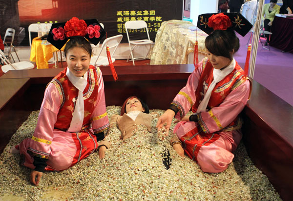 A customer lies buried in a pile of pearls, jade and agate to experience an alternative health therapy to improve sleep quality at the China International Exhibition Center in Beijing on Oct 22. The three-day exhibition showcases health and beauty products. [Photo by Zou Hong / Asianewsphoto]
