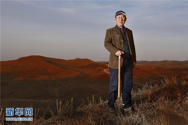 Wang Youde stands at the edge of the Mu Us Desert in Ningxia on Nov. 19, 2013. Known as China's "warrior of the sands", Wang Youde has been fighting the deserts in Ningxia Hui Autonomous Region since 1985. He is famous for planting 30,000 mu (about 2,010 hectares) of trees every year to prevent desertification. [Xinhua photo]