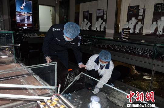 Two men robbed a jewelry store at Meizhou city of south China's Guangdong province on stormy Sunday night, according to the local public security bureau on Mar. 31, 2014. A total of 3,000g golden and silver jewelry were robbed, valued about 1.3 million yuan. [Photo/Mei Gongxuan]