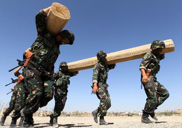 The picture shows that the officers and men are in log-carrying training under the scorching sun. A special operation brigade under the Xinjiang Military Area Command (MAC) of the Chinese People's Liberation Army (PLA) conducted training in a field training range located in the hinterland of the Gobi desert in late April. (Chinamil.com.cn/Zhou Wenchao)
