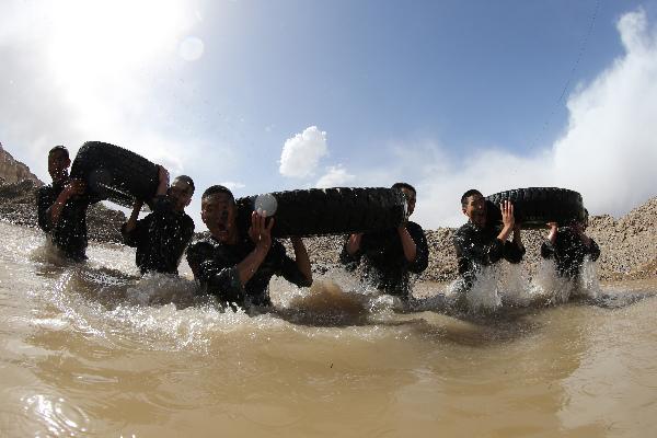 The picture shows that the officers and men tempter their extreme physical ability in muddy water. A special operation brigade under the Xinjiang Military Area Command (MAC) of the Chinese People's Liberation Army (PLA) conducted training in a field training range located in the hinterland of the Gobi desert in late April. (Chinamil.com.cn/Zhou Wenchao)