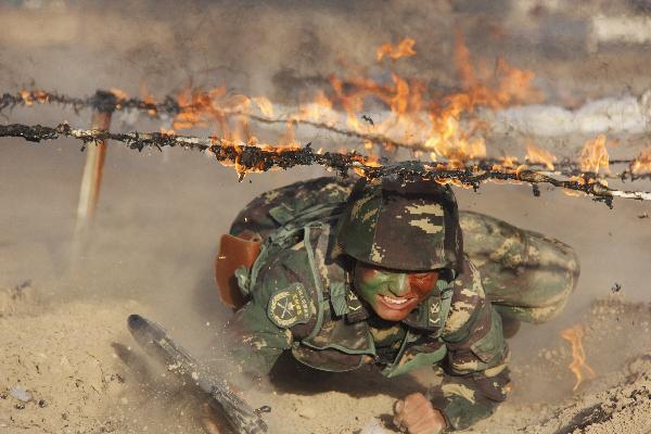 The picture shows that a special operation member is advancing by creeping under the fire barrier. A special operation brigade under the Xinjiang Military Area Command (MAC) of the Chinese People's Liberation Army (PLA) conducted training in a field training range located in the hinterland of the Gobi desert in late April. (Chinamil.com.cn/Zhou Wenchao)