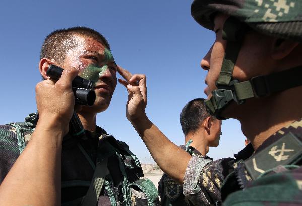 The picture shows that the squad leader is painting camouflage pigment on a squad member's face. A special operation brigade under the Xinjiang Military Area Command (MAC) of the Chinese People's Liberation Army (PLA) conducted training in a field training range located in the hinterland of the Gobi desert in late April. (Chinamil.com.cn/Zhou Wenchao)
