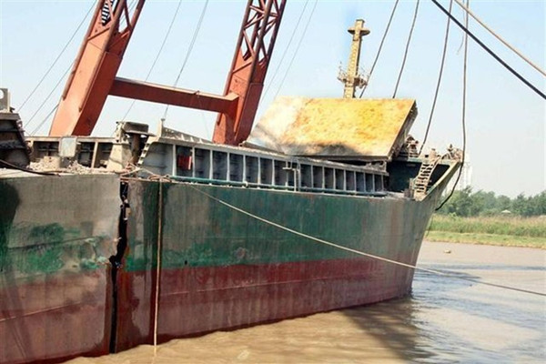 The sunken cargo vessel "Xinchuan 8," which split in half and sank in the Yangtze River in Nanjing almost a year ago, is shown after being salvaged yesterday morning. The craft was carrying 12,539 tons of limestone when it sank after colliding with a pier of the Nanjing Yangtze River Bridge in Jiangsu Province as it tried to pass through last May 12. All 18 crew members on board were rescued, but the river's flood season hampered salvage efforts until now. The boat was finally taken out of the water some 3.5 kilometers from the bridge at 9:30 yesterday morning.