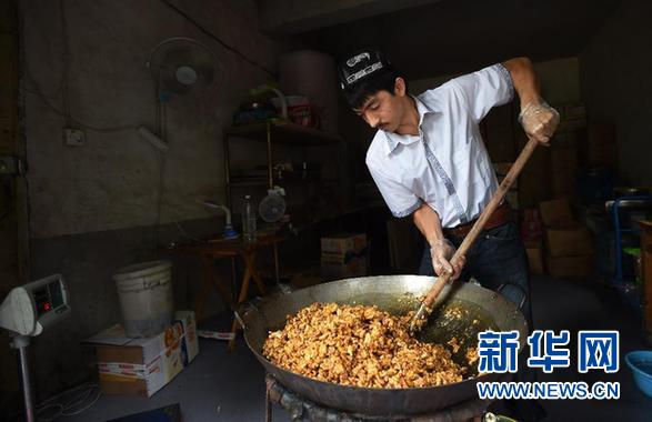 Adili,a Uygur student of Changsha University of Science and Technology in central China's Hunan Province, makes Xinjiang nuts cake on May 22, 2014. (Xinhua/Li Ga)