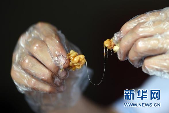 Adili,a Uygur student of Changsha University of Science and Technology in central China's Hunan Province, makes Xinjiang nuts cake on May 22, 2014. (Xinhua/Li Ga)