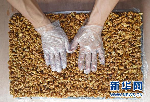 Adili,a Uygur student of Changsha University of Science and Technology in central China's Hunan Province, makes Xinjiang nuts cake on May 22, 2014. (Xinhua/Li Ga)