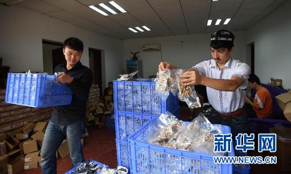 Adili (R) and Jiang Chunyang (L) package nuts cakes on May 22, 2014. (Xinhua/Li Ga)