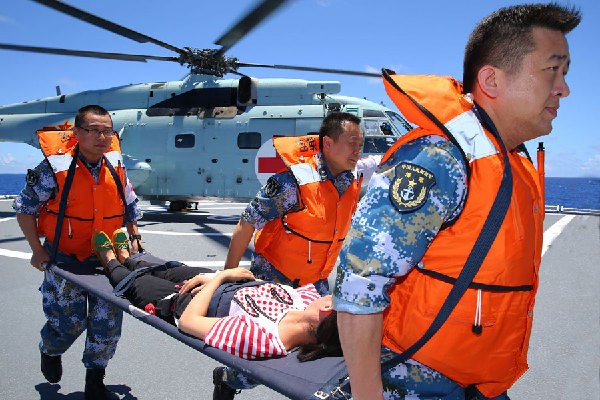 The picture shows that the wounded is in simulated transportation by a helicopter. The "Peace Ark" hospital ship of the Navy of the Chinese People's Liberation Army (PLAN) conducted disaster relief drill when participating in the Rim of Pacific (RIMPAC) multinational naval exercise in Hawaii on the morning of June 16, 2014. Various high-tech medical equipment and devices are put into use. (mil.cnr.cn/Ju Zhenhua)