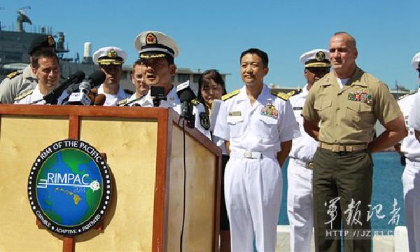 Sr. Capt. Zhao Xiaogang, commanding officer of the participating Chinese naval taskforce, answers questions at a press conference in Hawaii on June 30, 2014, local time. The United States Navy held an opening ceremony for the "Rim for the Pacific 2014" (RIMPAC) exercise, which was followed by a press conference in Hawaii, the United States, on Monday morning, marking the beginning of the RIMPAC exercise. (JZ. 81. cn/Wu Min)