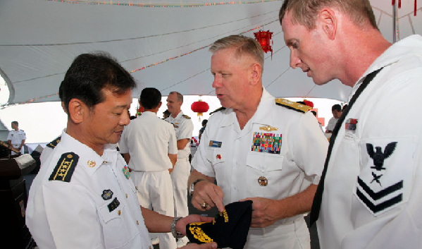Chinese and American naval officers exchange souvenirs during a deck reception on a Chinese warship in Hawaii, June 28, 2014, local time. The Chinese naval guided missile destroyer Haikou participating in the "Rim of the Pacific 2014" (RIMPAC) exercise held a deck reception in Hawaii on Saturday evening. (JZ. 81. cn/Liang Jie)