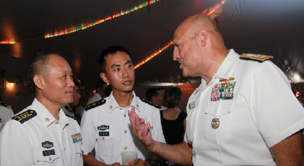 Two Chinese naval officers have a pleasant chat with their American guest during a deck reception on a Chinese warship in Hawaii, June 28, 2014, local time. The Chinese naval guided missile destroyer Haikou participating in the "Rim of the Pacific 2014" (RIMPAC) exercise held a deck reception in Hawaii on Saturday evening. (JZ. 81. cn/Liang Jie)