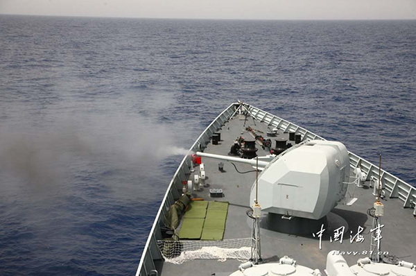 The photo taken on July 14 shows the Chinese naval destroyer Changchun fires the main gun in a joint drill. The 17th Chinese naval escort taskforce and the EU Combined Task Force 465 (CTF-465) staged a joint anti-piracy drill code-named "Venus 2" in the west sea area of Gulf of Aden from 6:30 to 15:00, July 14, 2014. Real Admiral Huang Xinjian, commanding officer of the Chinese naval escort taskforce and Real Admiral Jürgen zur Mühlen, commander of the EU CTF-465, directed the joint drill alternatively. (navy.81.cn/Ding Yubao)