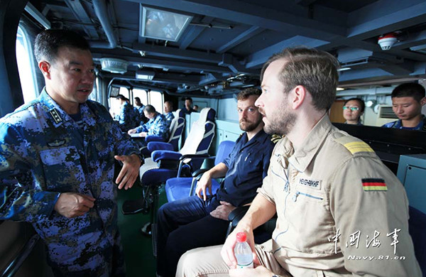 Wang Sheqiang (L), captain of the Chinese naval guided missile destroyer "Changchun", exchanges views with the liaison officer (R) of the EU CTF-465 during a joint drill on July 14. The 17th Chinese naval escort taskforce and the EU Combined Task Force 465 (CTF-465) staged a joint anti-piracy drill code-named "Venus 2" in the west sea area of Gulf of Aden from 6:30 to 15:00, July 14, 2014. Real Admiral Huang Xinjian, commanding officer of the Chinese naval escort taskforce and Real Admiral Jürgen zur Mühlen, commander of the EU CTF-465, directed the joint drill alternatively. (navy.81.cn/Ding Yubao)