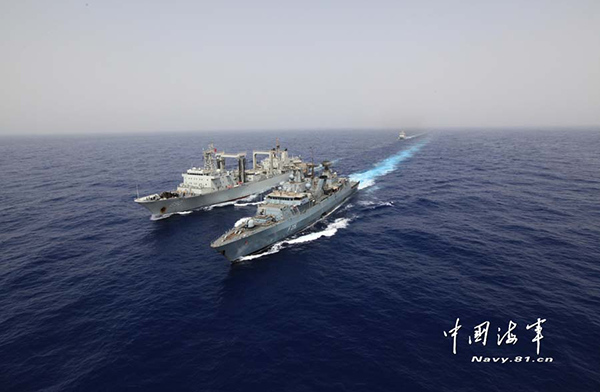The photo taken on July 14 shows the Chinese supply ship "Chaohu" (L) replenishes for the guided missile frigate "Brandenburg" of the German Navy in a joint drill. The 17th Chinese naval escort taskforce and the EU Combined Task Force 465 (CTF-465) staged a joint anti-piracy drill code-named "Venus 2" in the west sea area of Gulf of Aden from 6:30 to 15:00, July 14, 2014. Real Admiral Huang Xinjian, commanding officer of the Chinese naval escort taskforce and Real Admiral Jürgen zur Mühlen, commander of the EU CTF-465, directed the joint drill alternatively. (navy.81.cn/Ding Yubao)