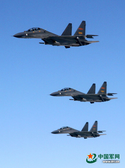 This photo taken on July 20, 2014 shows three Su-30 fighters of the Air Force of the Chinese People's Liberation Army fly to Russia to participate in the "Aviadarts-2014" international pilot competition. Upon invitation of the Russian Air Force, an aviation team and three Su-30 fighters of the Air Force of the Chinese People's Liberation Army to participate in the "Aviadarts-2014" international pilot competition to be held in Lipetsk and Voronezh, Russia from July 22 to 28, arrived at the Lipetsk Airport at 19:30 of July 20, local time. (Chinamil.com.cn/Yang Zhen)