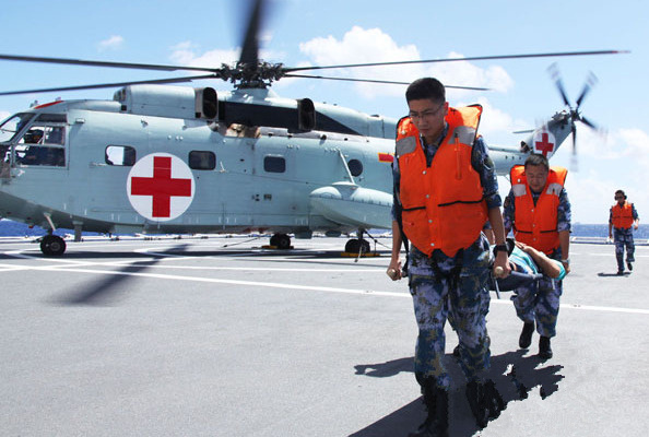 The Chinese naval medical workers transfer a wounded in a rescue drill on July 29 2014. The hospital ship Peace Ark of the Chinese People's Liberation Army Navy (PLAN), which is participating in the "Rim of the Pacific" (RIMPAC-2014) multinational naval exercise, conducted on Tuesday the 6th medical rescue drill as scheduled. It is the last drilling subject for the Peace Ark in the RIMPAC-2014 exercise. (navy.81.cn/Huang Yuping)