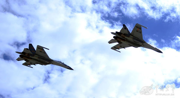 The photo taken on July 28 shows two fighters are flying at low-altitude in a defense penetration drill staged in northwest China. Recently, an aviation troop unit under the air force of the Lanzhou Military Area Command (MAC) of the Chinese People's Liberation Army (PLA) conducted the low-altitude and super-low-altitude defense penetration drill, in a bid to lift the overall combat capability of the troop unit to a new level. (kj.81.cn/Chen Qingshun)