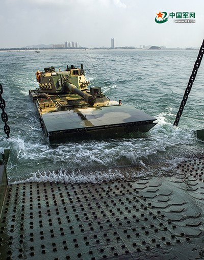 An amphibious assault vehicle is getting into the amphibious landing ship. An amphibious armored detachment under the Nanjing Military Area Command (MAC) of the Chinese People's Liberation Army (PLA) cooperated with the Navy of the PLA (PLAN) to conduct the full-floating loading and beach landing drill in a sea area of the East China Sea on August 3, 2014, in a bid to temper the troops' real-combat capability. (Chinamil.com.cn/Jiang Jiang'ao)