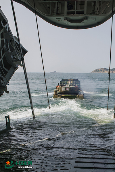 An amphibious armored detachment under the Nanjing Military Area Command (MAC) of the Chinese People's Liberation Army (PLA) cooperated with the Navy of the PLA (PLAN) to conduct the full-floating loading and beach landing drill in a sea area of the East China Sea on August 3, 2014, in a bid to temper the troops' real-combat capability. (Chinamil.com.cn/Jiang Jiang'ao)