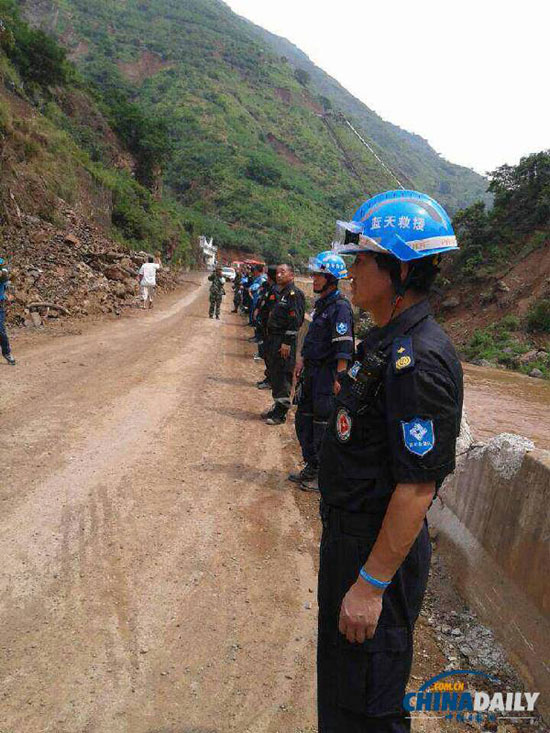 Red Cross Blue Sky Rescue Team, equipped with an underwater life detector, worked with the soldiers trying to save more lives. Xie Qiao, a soldier who helped rescue earthquake victims in Yunnan province on Aug 3, died while saving a senior from a river. A 6.5-magnitude earthquake have so far killed at least 617 people and injured more than 3,000 in the southwestern China's remote area. [Photo by Shan Juan/chinadaily.com.cn]