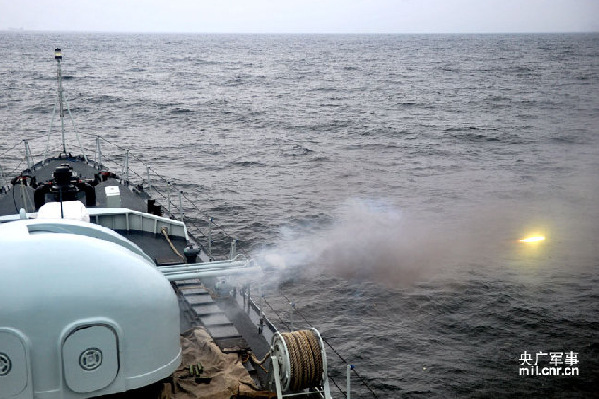 A warship is firing. The North China Sea Fleet of the Navy of the Chinese People's Liberation Army (PLAN) conducted a joint defense combat drill in waters of the Yellow Sea from August 5 to 7, 2014, in a bid to improve its troop's combat capability. (mil.cnr.cn/Yang Xinru)