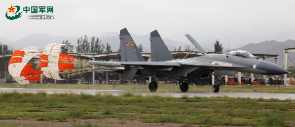 The two-aircraft formation is taking off. A two-aircraft formation of an aviation division of the air force under the Lanzhou Military Area Command (MAC) of the Chinese People's Liberation Army (PLA) conducted the actual-combat confrontation training at a military airport in northwest China on August 11, 2014. (Chinamil.com.cn/Xi Bobo)