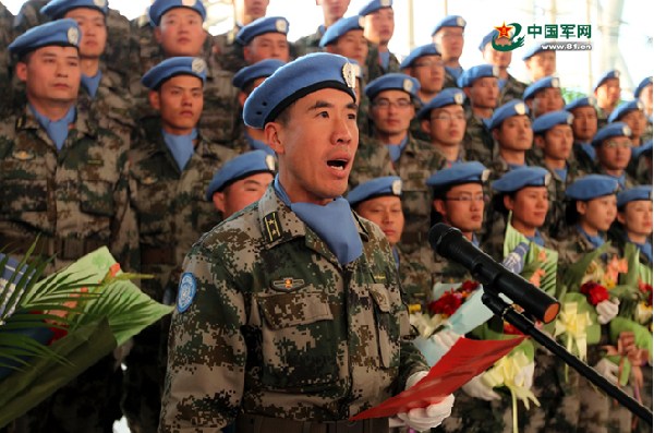 Wu Jianben, commander of the 13th peacekeeping contingent to South Sudan, is making a speech at the expeditionary ceremony on behalf of the officers and men. 100 officers and men of the first echelon of the 13th Chinese peacekeeping contingent left the Ji'nan Yaoqiang International Airport for the Wau mission area in South Sudan on November 18, 2014, to carry out an eight-month-long peacekeeping mission. (Chinamil.com.cn/Qiu Chengliang)